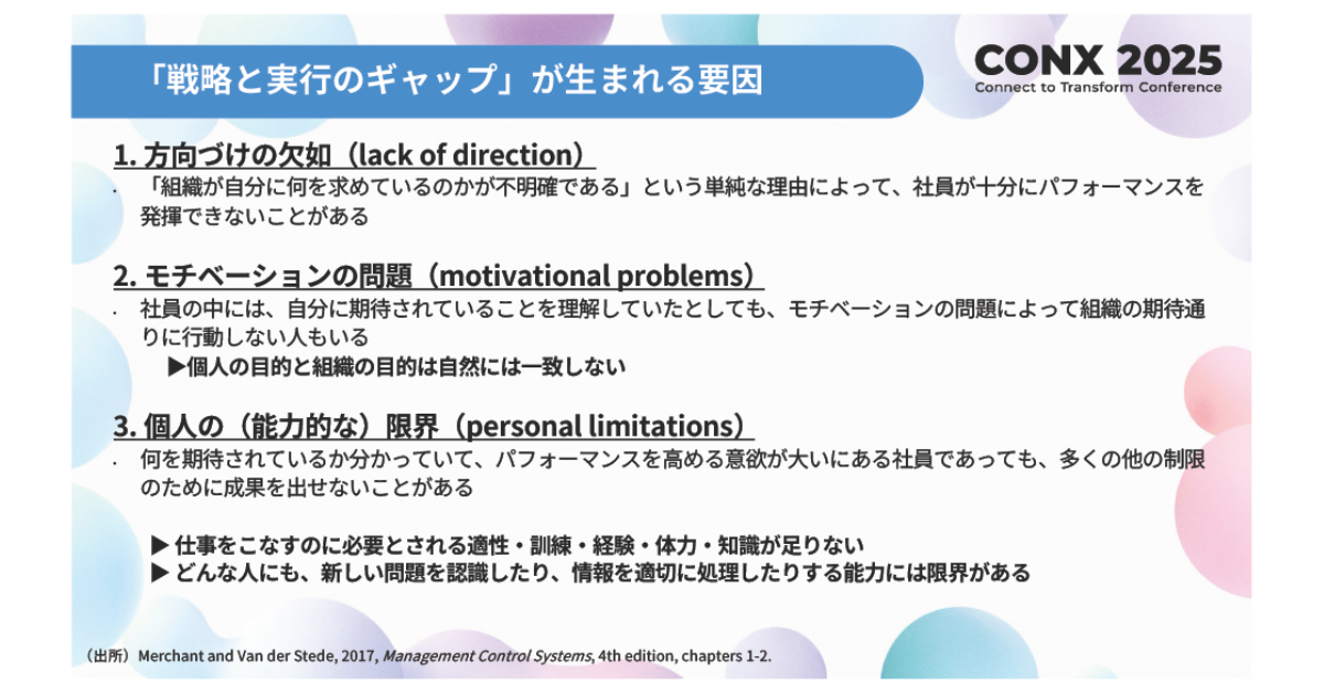 第二の壁は「モチベーションの問題(motivational problems)」。期待されている行動は理解していても、それに取り組む「やる気」が湧かない状態だ。この主な原因は「個人の目的と組織の目的が自然には一致しない」ことにある。個人のキャリアプランや価値観と、会社が提示する目標との間に繋がりを見出せない限り、社員の動機付けは困難になる。
