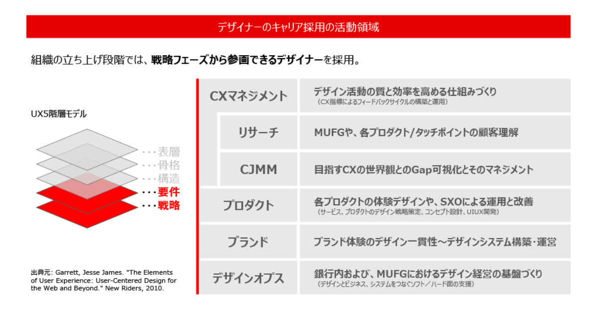 ジェシー・ジェームズ・ギャレット氏が、著書『The Elements of User Experience』で提唱した、ウェブサイトや製品のユーザーエクスペリエンス(UX)を設計するためのフレームワークに「UX5段階モデル(戦略・要件・構造・骨格・表層)」がある。MUFGでは、その中でも、特に上流である「戦略」「要件」を担えるリーダー格の人材を外部から採用。昨年(2024年)の立ち上げ期はインハウスデザイナー8名体制だったが、関連会社や外部パートナーも含め、次期中期経営計画期間中には全体で100名規模のデザインを回す体制を目指している。