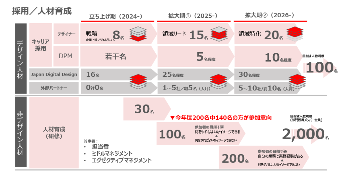 「今中計期間中は300名単位で研修を行い、来中計の期間では、事業本部の2,000名全員がデザインを理解している状態を目指しています。また、担当者が実務を学ぶだけでなく、ミドルおよびシニアマネジメント層がデザインをいかに経営に取り込むかに関する研修が肝要だと思っています」と、長谷川氏は意気込む。