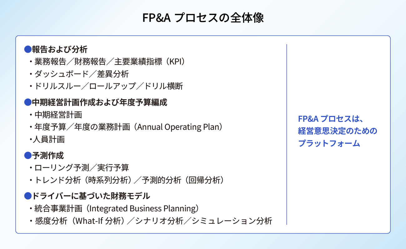 FP&Aプロセスでは「3.予測作成」「4.ドライバーに基づいた財務モデル」が中心です。