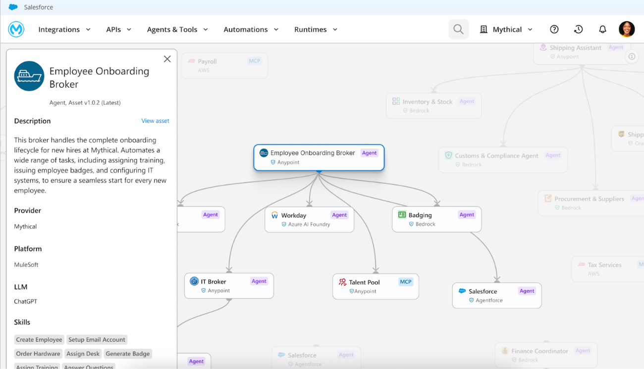 - AIエージェントの意思決定をエンドツーエンドで可視化:「MuleSoft Agent Visualizer」により、ITチームにAIエージェント間の関係性を示す動的なマップを提供。AIエージェントがどのように接続され、相互作用し、動作するかが示される。ブラックボックス化されたAIを可観測性のあるシステムに変えることで、パフォーマンスの最適化、障害の防止、エージェンティック・ワークフォースへの信頼構築に必要なインサイトを提供する。