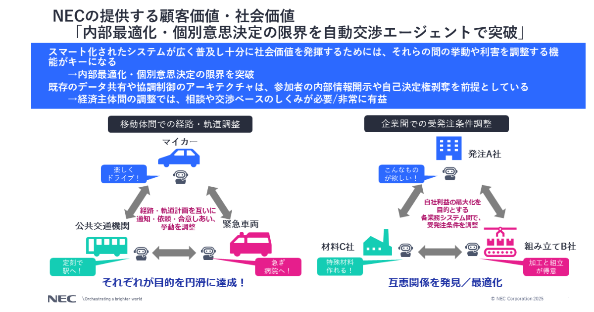 森永:AI対人、AI対AIの両方を想定しています。実証実験では、買い手(NEC側)に自動交渉AIを入れ、相手(サプライヤー)は人間のままで試しました。AIが標準化されたメッセージを送り、交渉を主導します。