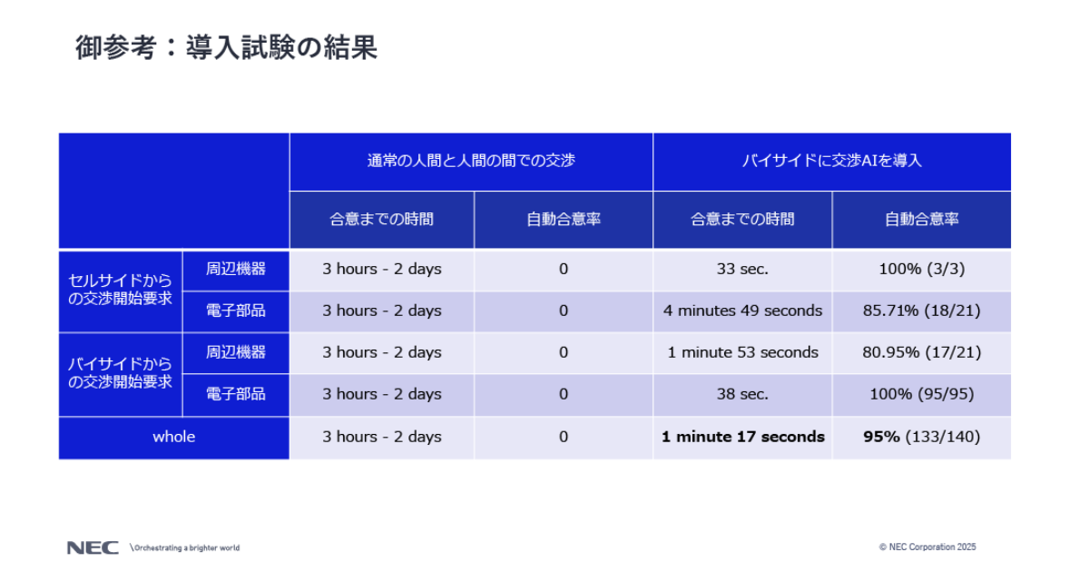 森永:NECグループ会社の部品購買業務で実証試験を行い、サプライヤーとの調整に自動交渉AIを使いました。対象業務は、人間同士で従来「3時間~最大2日」かかっていた納期や数量の調整業務です。