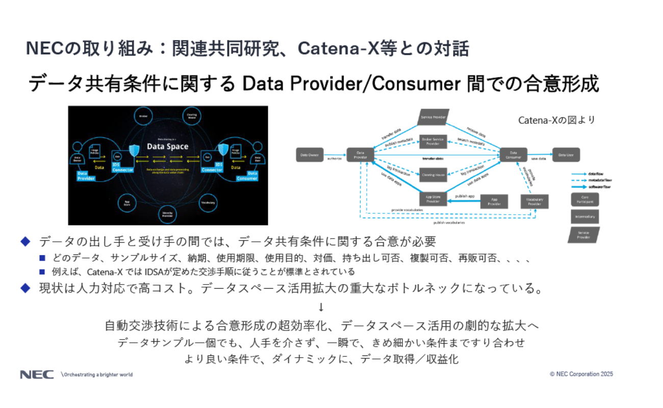 森永:そのとおりです。データスペース活用のボトルネックは、「どのデータを、いつまでに、いくらで、どの目的に使うか」といったデータ共有条件の合意形成が、現状「人力で高コスト」な点です。