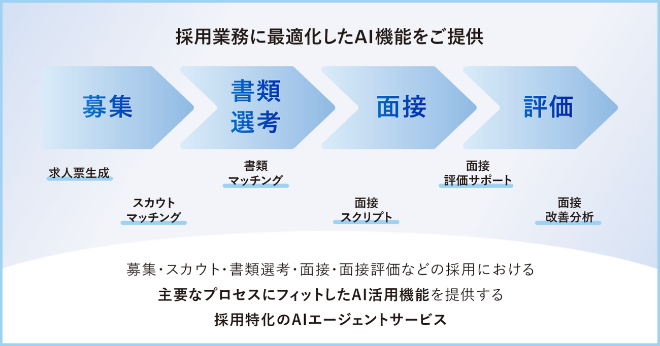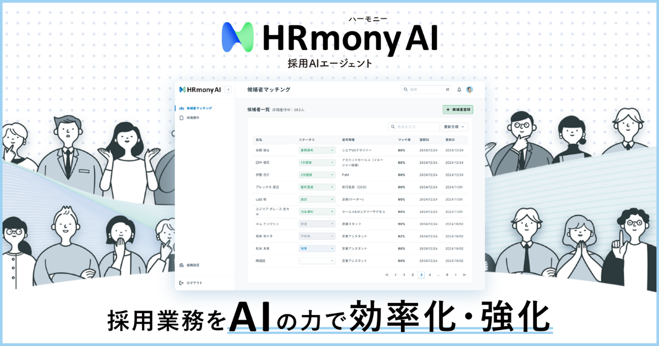 HRmony AIは、日常的な人事採用業務を、AIを使い効率化・標準化する採用特化型のAIエージェントサービス。募集・スカウト・書類選考・面接・面接評価など、採用における主要なプロセスにフィットしたAI活用機能を提供する。候補者体験の向上など人事担当者が介在すべき部分に、担当者が注力できる環境づくりを後押ししていくことで、企業の採用力の強化と組織力を向上。