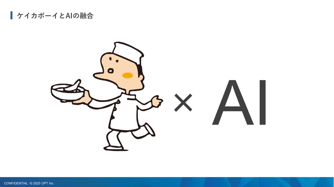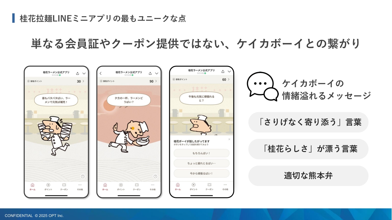 その世界観を象徴するのが、公式キャラクターの「ケイカボーイ」だ。竹村氏が率いるオプトは、このケイカボーイにAIを組み合わせることで、ユーザーの愛着を育むユニークなLINEミニアプリを開発した。