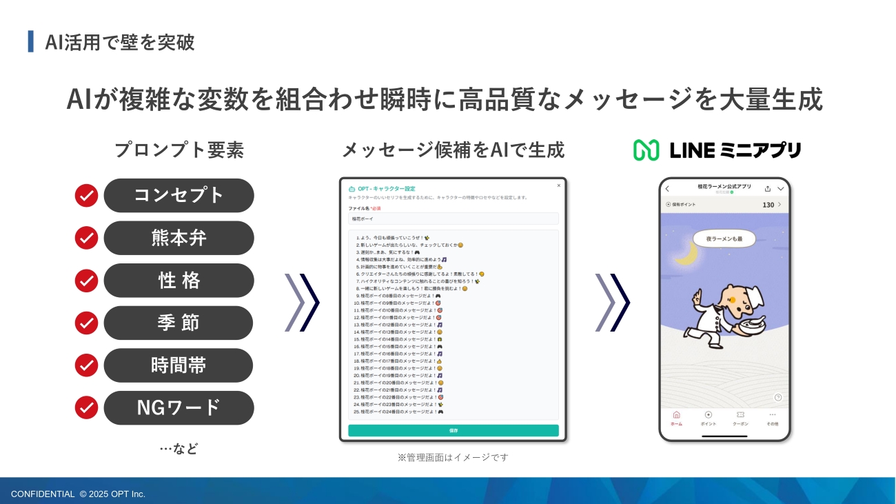 「コンセプトや熊本弁のニュアンス、キャラクターの性格、時間帯といった複数のコンテキストをプロンプトとしてAIに学習させ、精度の高いメッセージ候補を瞬時に大量生成できるようにしました。現在表示されているメッセージはAIが生成したものです。(竹村氏)