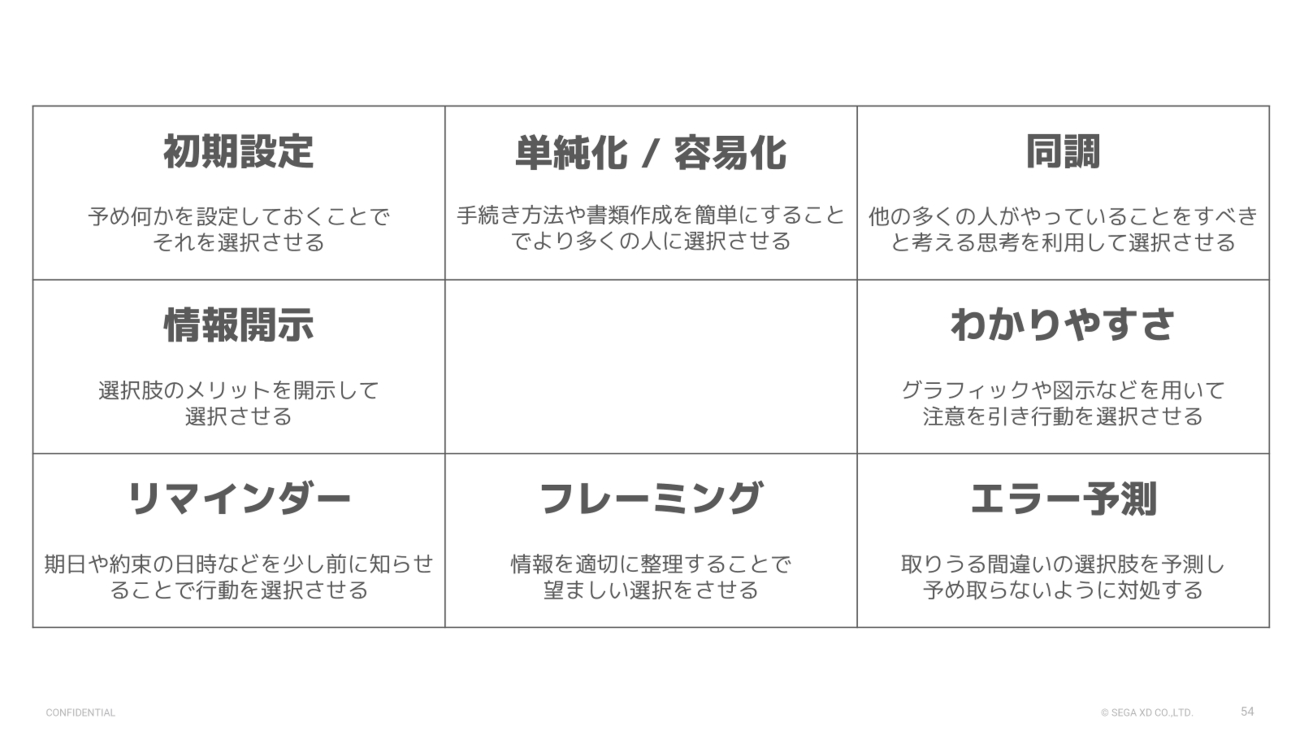 伊藤氏は、こうした行動経済学の多様な知見の中から、特にビジネスの実務で応用しやすいものを八つの構成要素(初期設定、単純化/容易化、同調、情報開示、わかりやすさ、リマインダー、フレーミング、エラー予測)として整理した。