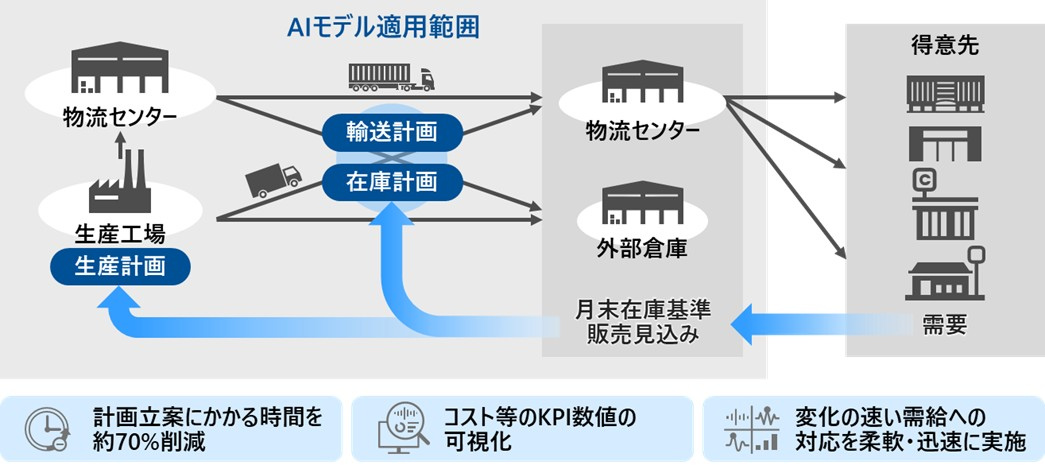これにより、システムを構成する基本機能を部品として保有しながら、計画立案に必要な業務ルールを顧客の業務モデルに合わせて細部まで反映するセミオーダー型のソリューションを実現。季節変動により需要が大きく左右されるニチレイ・アイスの包装氷の生産・在庫・輸送の計画立案にかかる時間を約70%削減することを確認している。高精度かつ実運用に十分対応できるサプライチェーン全体の計画立案が可能となり、従来の汎用的なパッケージでは実現できなかった現場に根ざした最適化を実現。