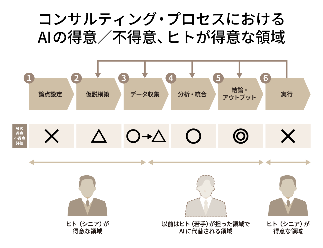 そう考えると、人間に残される仕事は「1:論点設定」「2:仮説構築」と、仮説検証のプロセスを含む「6:実行」です。最近、マッキンゼーやBCGが若手コンサルタントの人員配置を最適化しているという話を聞きますが、若手のアナリストが主に担当するのは「4:分析・統合」「5:結論・アウトプット」ですから、当然の流れにも思えます。