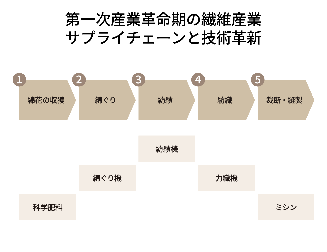 第一次産業革命の発端となったのは繊維産業です。大まかに繊維産業のプロセスは、「1:綿花の収穫」「2:綿ぐり」「3:紡績」「4:紡織」「5:裁断・縫製」ですが、第一次産業革命ではまず紡績機の発明により「3:紡績」の生産性が飛躍的に高まりました。