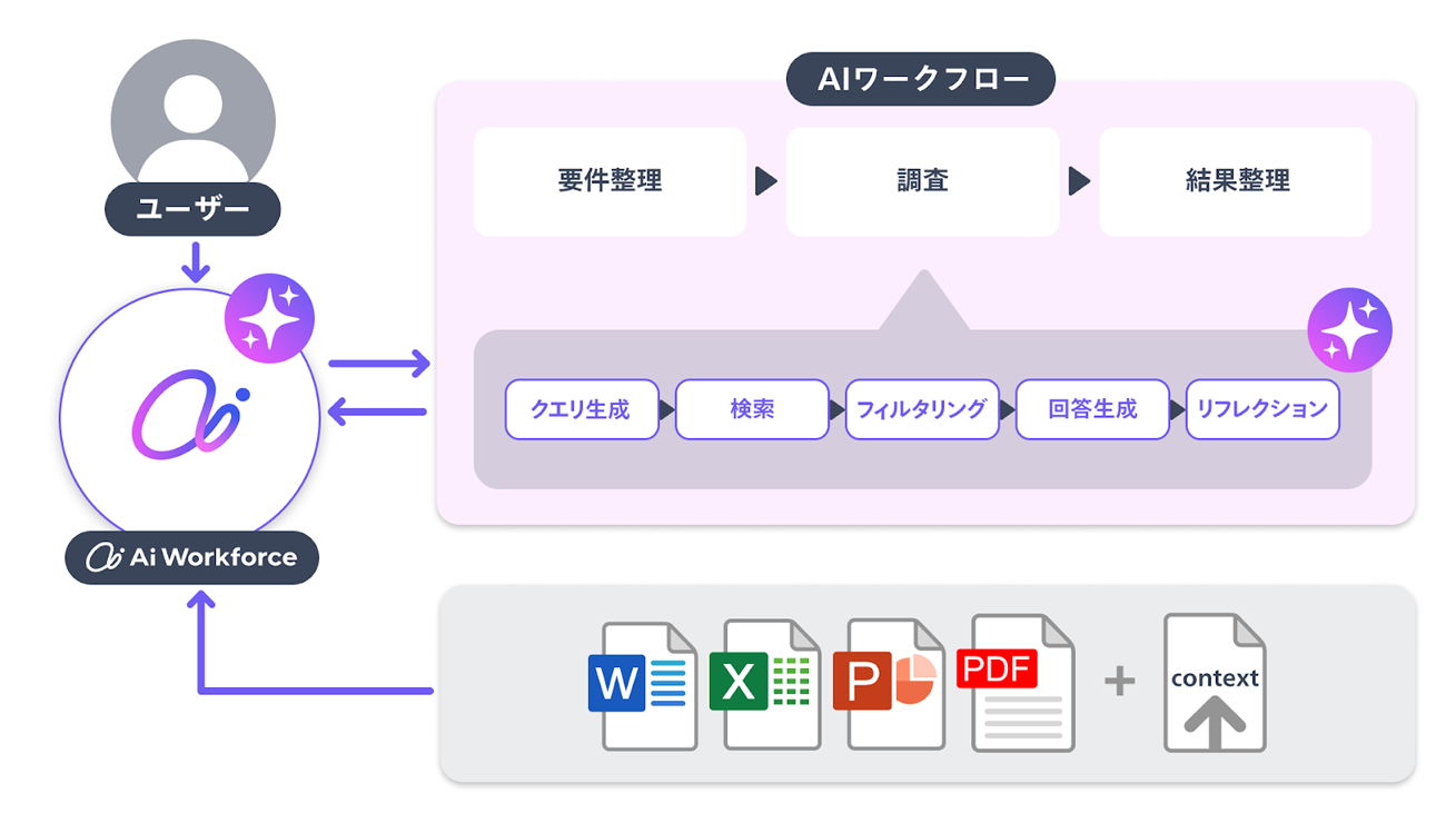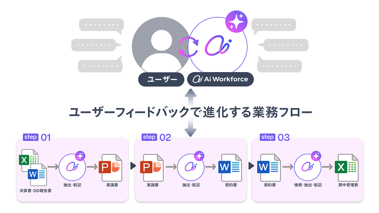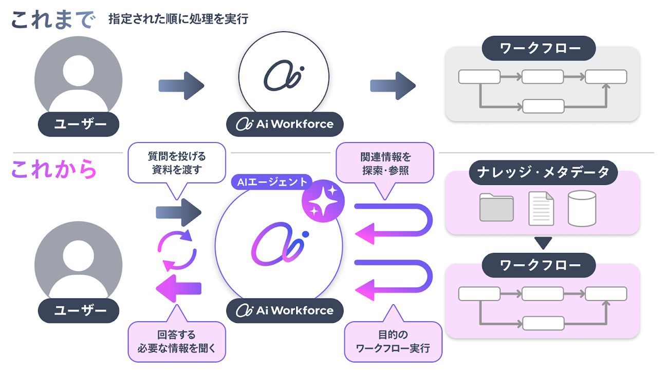Ai Workforceは、連続的で多様な業務の自動化を実現するプラットフォーム。同社はAi Workforceで得られた成果をさらに発展させるため、業務の連続性に着目した。実際の現場では単発の処理では完結せず、複数のステップが連続するケースが大半。AI技術の進化に伴ってこうした現場の実情に対応し、業務の成果を「意思決定・検証・提案」という本質的な領域まで広げるべくAi Workforceを再設計した。