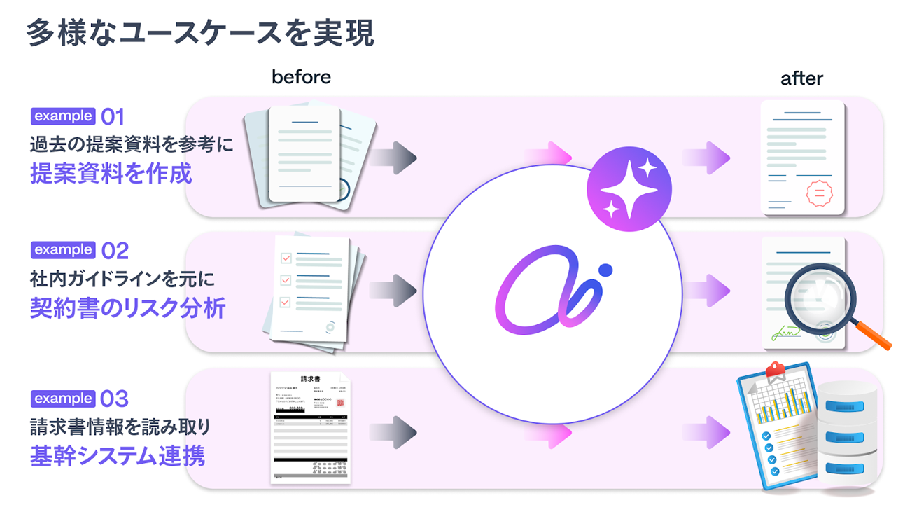 また、AIエージェントやAIワークフローは、ドキュメント検索や参照、ファイル処理のような標準的なツールや、個社向けのツール(基幹システムとの連携など)を組み込んで利用することも可能。これにより、個社固有の多様な業務にすみやかにAIエージェントを導入できる。