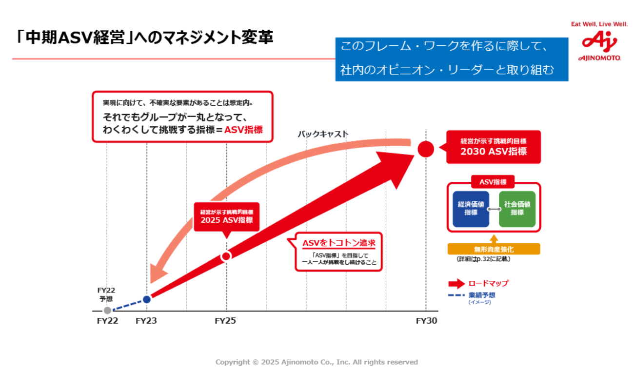 水谷英一氏(以下、水谷):私たちが中期経営計画に代わるものとして2023年に策定したのが、中計ASV(Ajinomoto Group Creating Shared Value)経営における「2030ロードマップ」です。その実現に向けて全社で共有しているのが「企業価値の算定式」です。