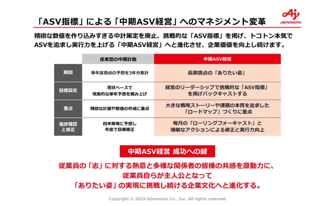 水谷:その通りです。どんなに精緻な計画でも、実行が遅ければ環境変化に取り残されます。従来、中期経営計画では精緻な数値の積み上げに多大な労力を割いていましたが、私たちはそれを廃止し、より長期的視点である「ASV指標」を掲げる「中期ASV経営」へとマネジメントを変革しました。