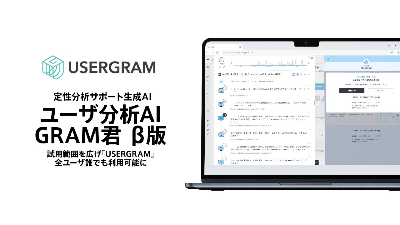 ユーザ分析AI GRAM君は、定性分析において最も負荷のかかる部分である「膨大なデータの理解」と「そこからのユーザ状況理解・課題の推察」を生成AIが代替するUSERGRAMの新機能。2025年1月よりクローズドβ版として限定的に複数の既存顧客に試用されていたが、フィードバックを受けてさらに機能を向上させつつ、利用顧客の幅をUSERGRAMの全顧客にまで広げ、この度パブリックβ版として公開した。