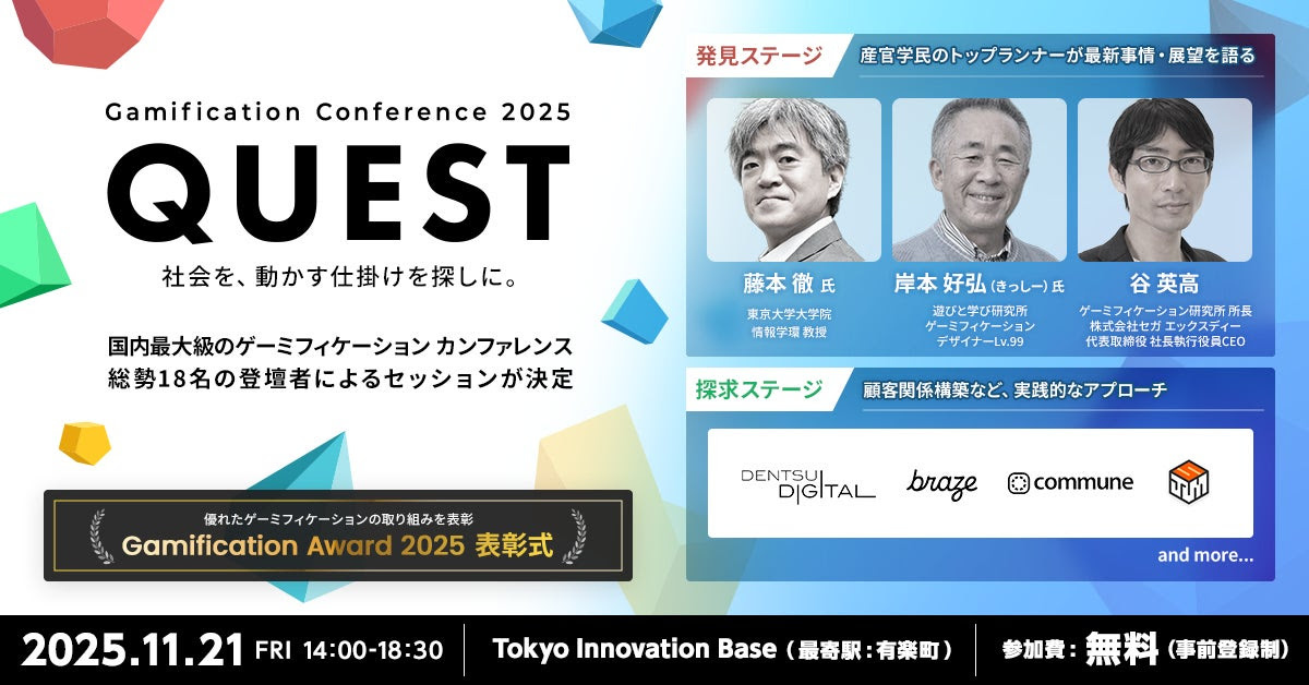 また、発見ステージでは「Gamification Award 2025」の表彰式も行われる。Gamification Award 2025は、ゲーミフィケーションを活用している優れた取り組みを実施した企業・団体を表彰するもの。2024年10月~2025年9月に、ゲーミフィケーションに関する取り組みを発信している企業・団体を対象に、審査委員が卓越した活用実績と判断した取り組みを表彰する。