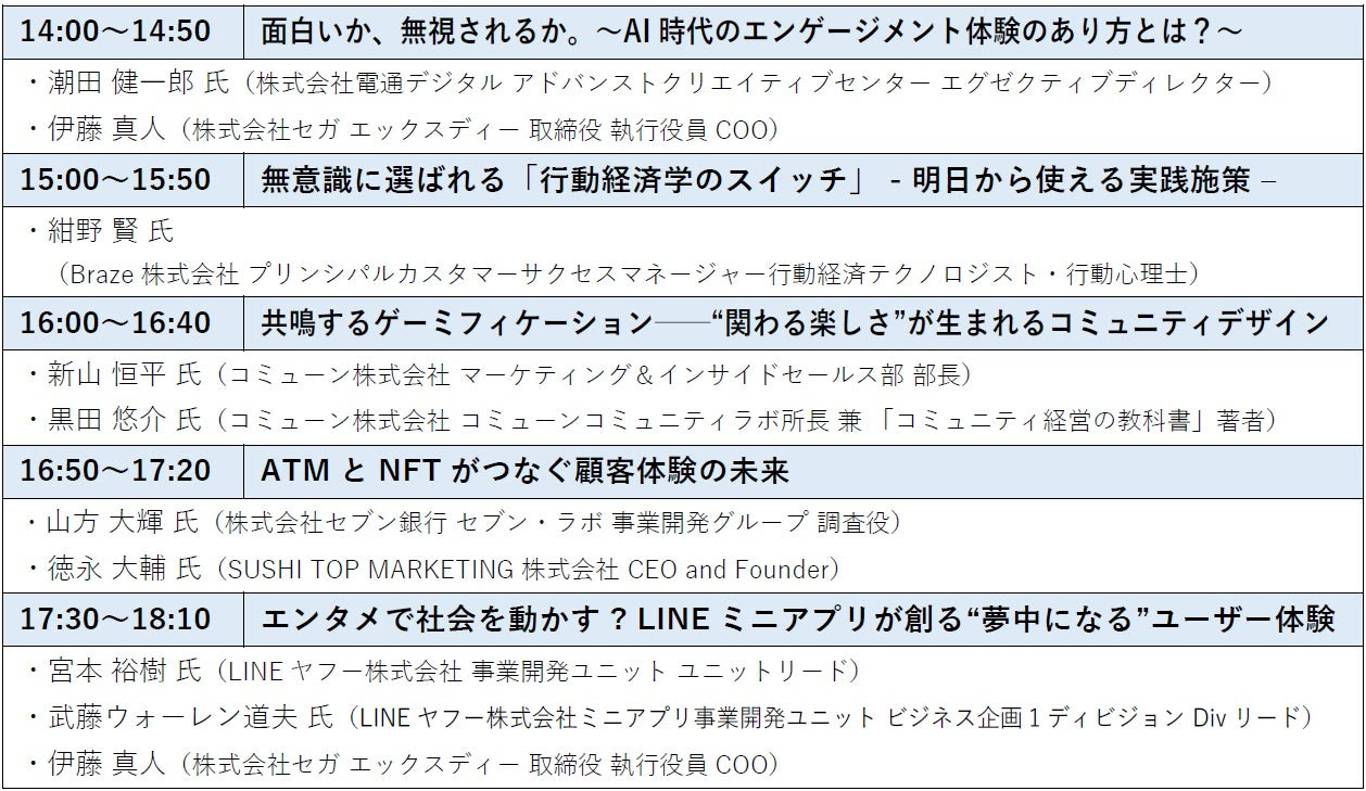 | 探求ステージ | ゲーミフィケーションに取り組む事業者が集い、ゲーミフィケーションの社会実装をテーマに、企業活動/社会課題解決に向けて実践的なアプローチについて議論を深める。 |