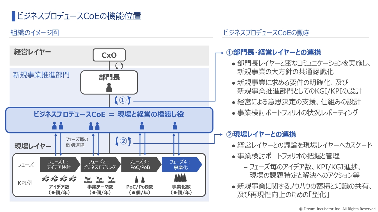 そのため、新規事業を実際に検討・推進する現場メンバーと、新規事業部門全体の責任者の間に、独立した形でビジネスプロデュースCoEが入っていくという立ち位置が効果的です。