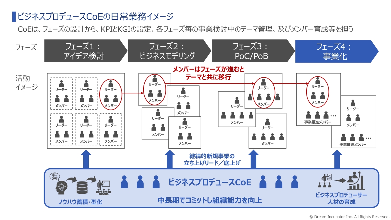 現場のリーダーはテーマと共に事業化フェーズに移行しますが、ビジネスプロデュースCoEは中長期で新規事業組織にコミットすることで組織能力を向上し、各社独自の新規事業の「特殊解」を作り上げます。
