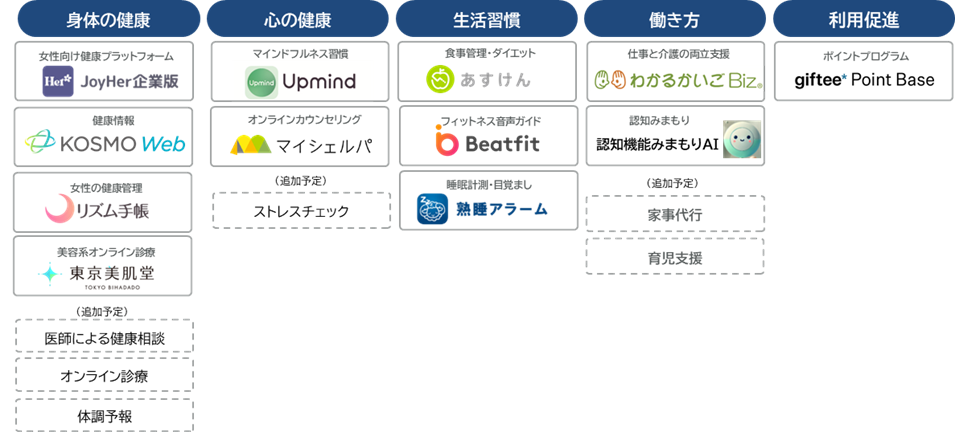 ダイエット、フィットネス、メンタルケア、介護、フェムテックなどで人気のアプリ・サービスを厳選して提供。今後は、育児支援、家事代行、オンライン診療などのサービスも順次拡充予定だという。