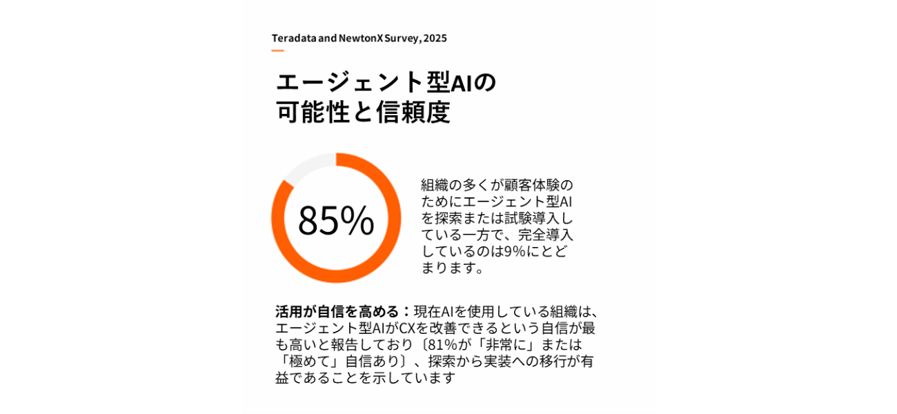 Teradataは、経営幹部およびAIリーダー500名超を対象に実施した最新調査の結果を発表した。同調査では、顧客体験(CX)向上を狙うエージェント型AIへの取り組み状況、ROI期待、運用上の障壁などを多角的に分析している。