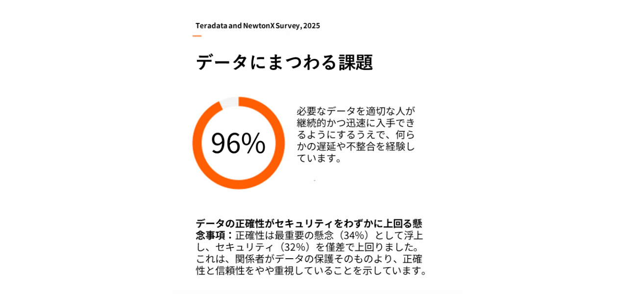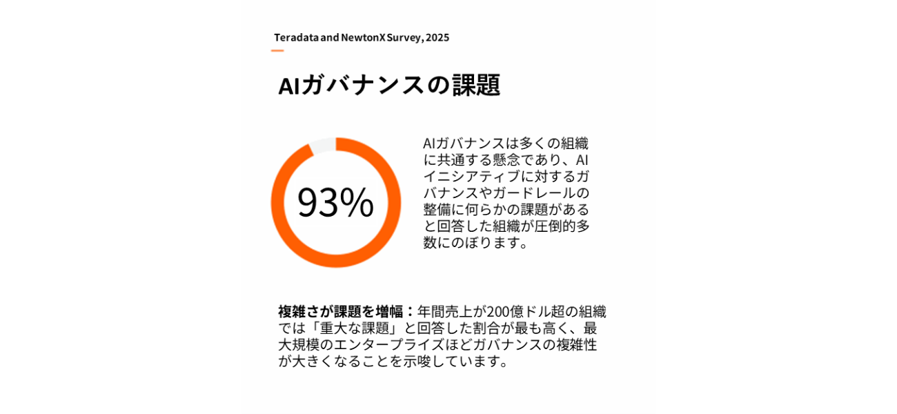 93%がAIガバナンスに課題を抱え、年商200億ドル超の企業では42%が「重大な課題」と回答。データの正確性(34%)がセキュリティ(32%)をわずかに上回り最大の懸念となっている。適切なデータを迅速かつ一貫して提供できると回答した企業は4%にとどまり、96%が遅延や不整合を経験。また、AIイニシアティブ推進に必要スキルをすでに保有している企業は13%のみで、社内教育や外部人材活用によるスキル獲得が急務となっている。