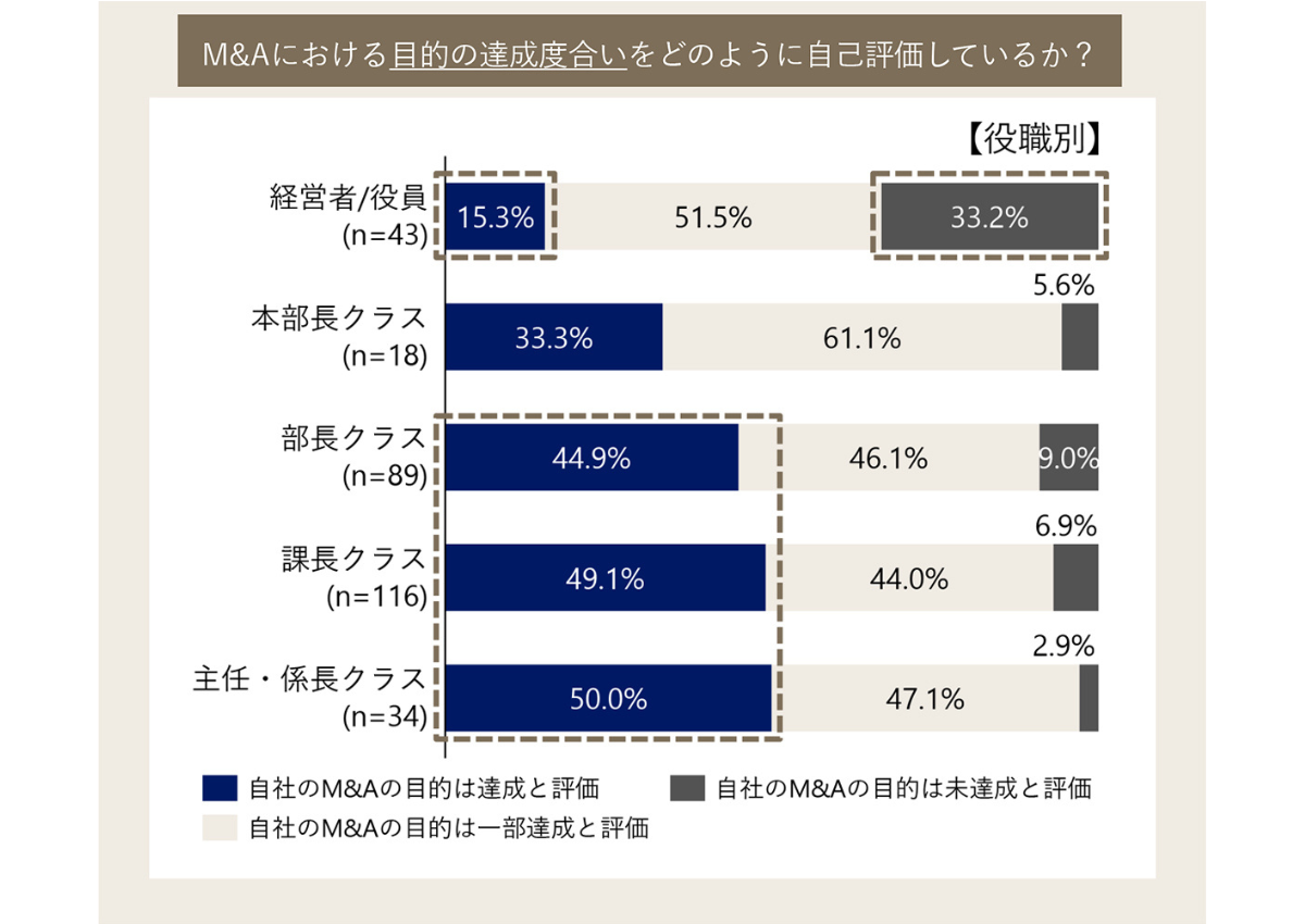 役職別では経営層の評価が最も厳しく、「目的達成」と答えたのはわずか15.3%にとどまり、「未達成」という回答は33.2%と、他役職と比較して最も多い結果となった。対照的に「主任・係長」「課長」「部長」といったミドルマネジメント層では、約半数がM&Aによる目的達成を高く評価。経営層とミドルマネジメント層の間に大きな認識のギャップが存在することが明らかになった。