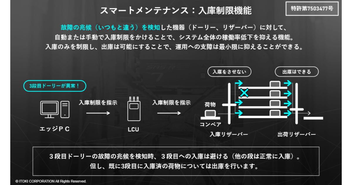 2つ目は、AIによる異常検知と自動入庫制限である。設備の異常が感知された場合、当該機器に入庫を制限し、出庫のみ継続稼働させることでシステム全体の停止連鎖を防ぐ。現場での突発的なダウンタイム抑制に寄与する。
