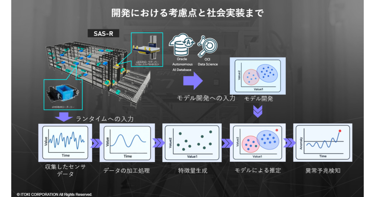 本システムは、日本オラクルの「Oracle Autonomous AI Database」と「Oracle Cloud Infrastructure(OCI) Data Science」を基盤に、自動物流倉庫「システマストリーマー SAS-R」の稼働データを収集・解析する。センサーや制御装置から稼働時間、動作回数、動作距離といったデータを収集し、AIによる異常検知アルゴリズムが設備の状態や故障の兆候を判断する。これにより、突発的な設備停止のリスクを軽減し、安定的な業務運用と計画的な保守を実現する。