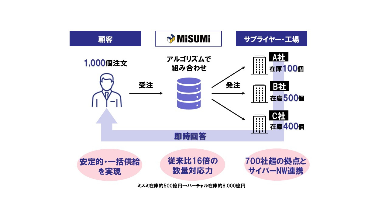 D-JITでは、グローバル700社以上のサプライヤーをサイバー連携し、在庫情報を統合・可視化することで、MISUMI ECサイトで提供できる数量を大幅に向上。これにより、購買担当者が在庫のあるサプライヤーを探し回る手間や、MISUMI ECサイトで必要数量がそろわない事態が解消される。
