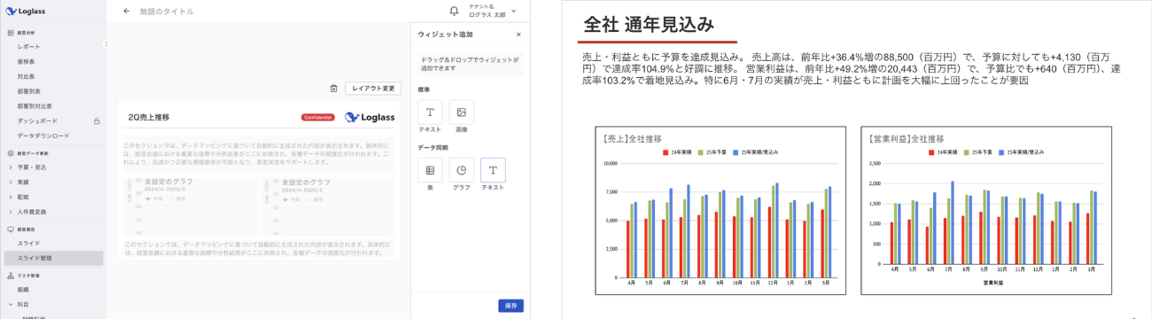 月次会議資料や取締役会報告書の作成をAIで自動化。実績データの集計に加え、会社で発生した事象を踏まえた業績分析や定性コメントの生成を行い、大幅な業務効率化と経営の意思決定を加速させる報告へのアップデートを図る。