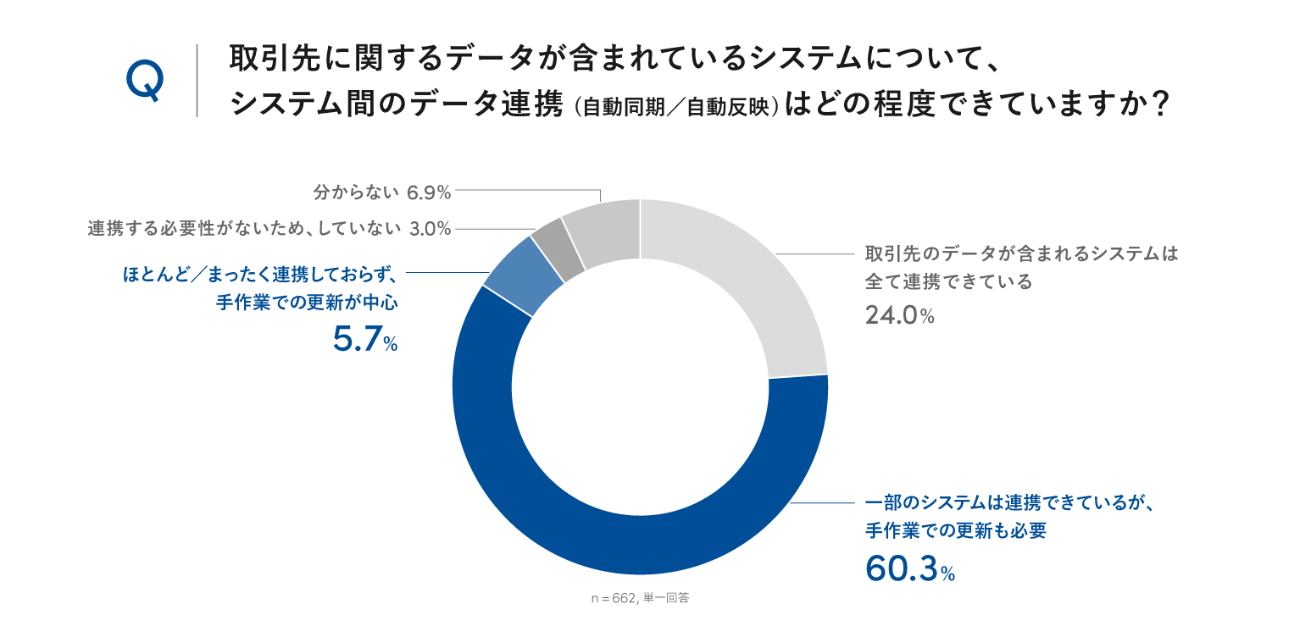 取引先データを扱うシステム間でデータ連携ができているかを尋ねたところ、「一部のシステムは連携できているが、手作業での更新も必要」または「ほとんど/まったく連携しておらず、手作業での更新が中心」と回答した企業が66.0%にのぼった。