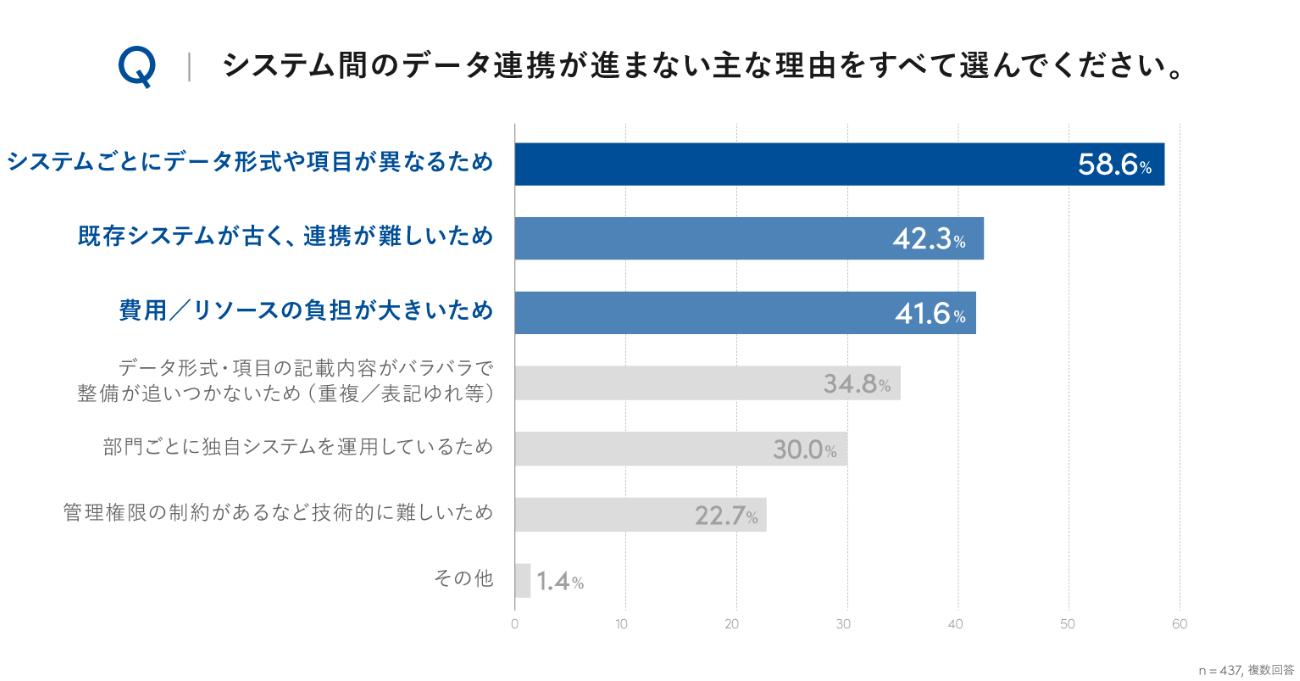 データ連携が進まない理由としては、「システムごとにデータ形式や項目が異なる」(58.6%)、「既存システムが古く、連携が難しい」(42.3%)、「費用・リソースの負担が大きい」(41.6%)が挙げられた。