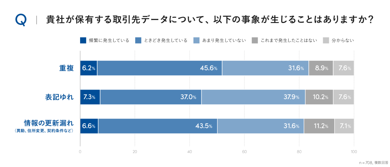 取引先データの品質について尋ねたところ、83.5%が「重複」、82.2%が「表記ゆれ」、81.8%が「更新漏れ(異動・住所変更・契約条件など)」の経験があるという結果に。