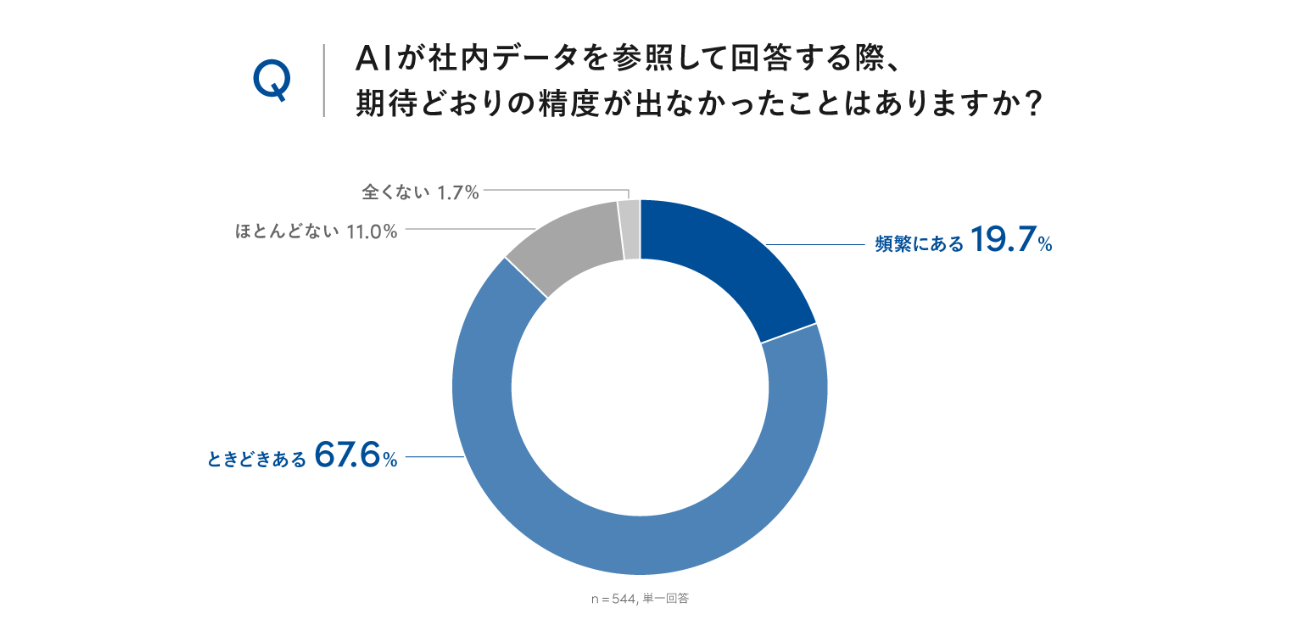 AIとシステムを連携している企業のうち87.3%が、AIが社内システム上のデータを参照しても期待どおりの精度が出ないことが「頻繁にある」または「ときどきある」と回答。データ基盤の整備不足が、AI活用の効果にも影響していることがうかがえる。