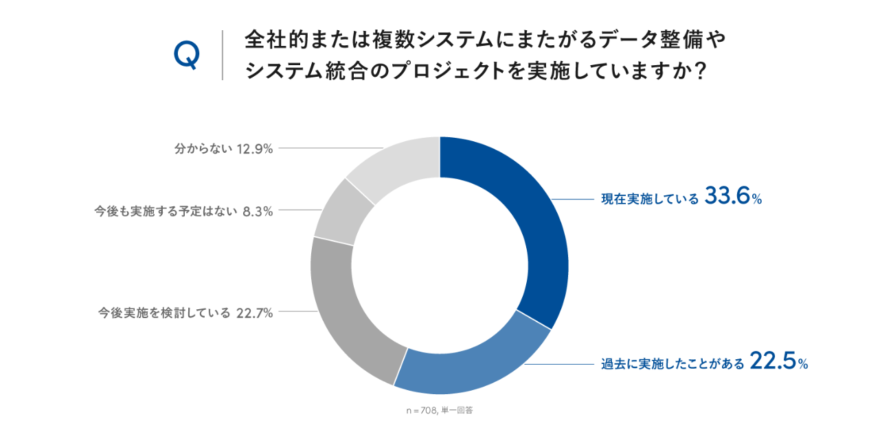 自社においてシステム統合やデータ整備のプロジェクトを実施しているか尋ねたところ、現在実施している企業が33.6%、過去に実施した企業が22.5%。両者をあわせると56.1%で、半数を超える企業が何らかの形で取り組みを進めていることが明らかになった。