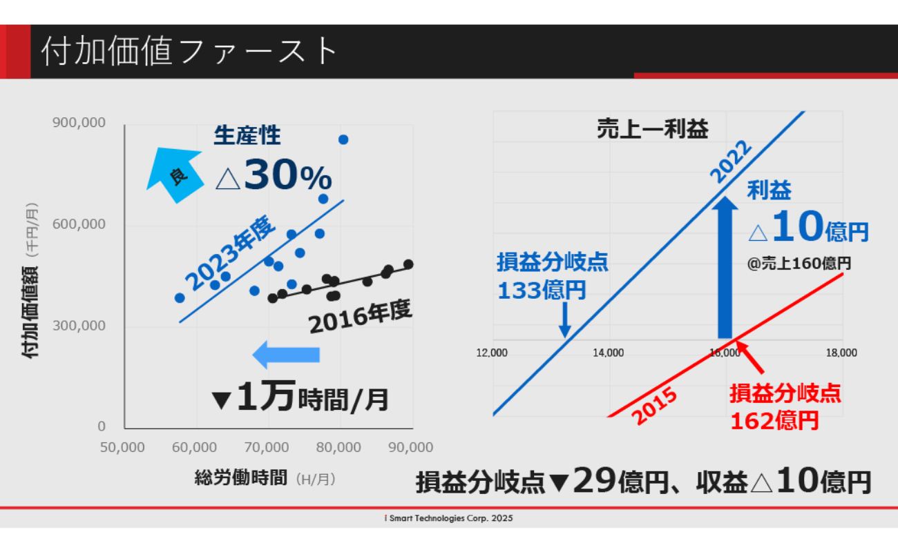 これまでのIoT活用による実績は、労務費などの固定費削減を進めた結果、損益分岐点を29億円引き下げることに成功しました。さらに、同じ売上規模でありながら利益を10億円上乗せし、生産性は30%向上しています。
