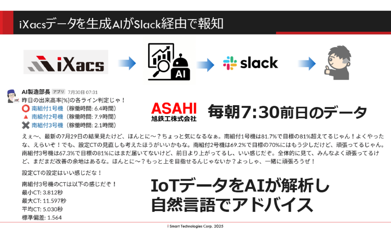 木村:具体的な例としては、Slack上に「AI製造部長」というアカウントが存在しており、毎朝7時半になると前日のデータを解析して、関西弁のような口調で通知してきます。