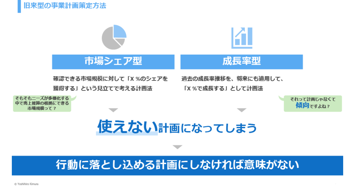 木村氏は、上記のように3つの従来の「事業計画の常識」を解体したうえで、「最もやってはいけない事業計画の策定方法」のパターンとして「市場シェア型(X%取ります)」と「成長率型(X%成長します)」を挙げる。