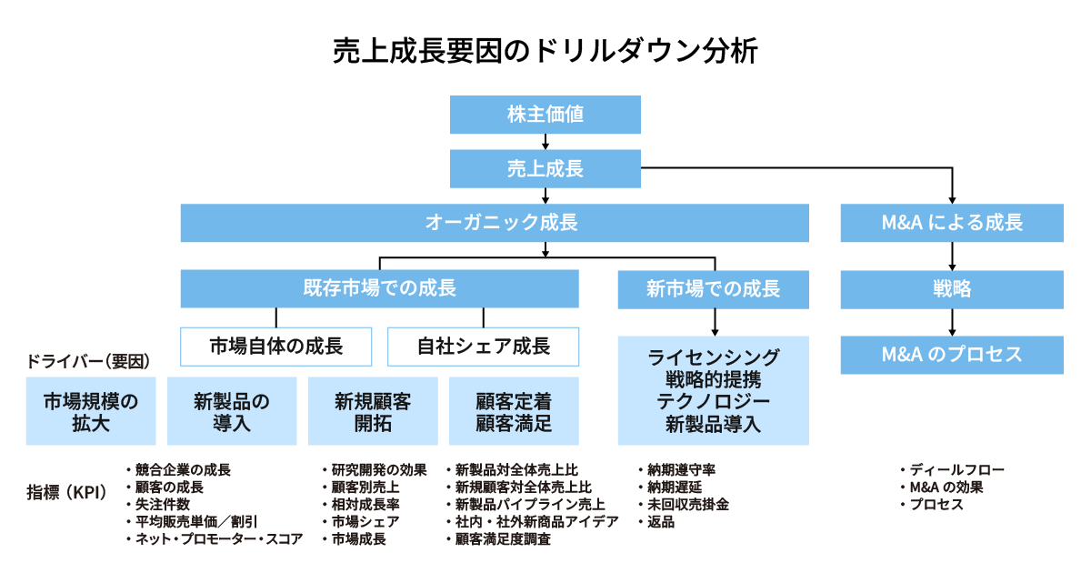 書籍では構造化の一例として、以下のように「売上成長要因のドリルダウン分析」を示しています。このレベルで分解することで戦略を具体的な施策に落とし込めます。