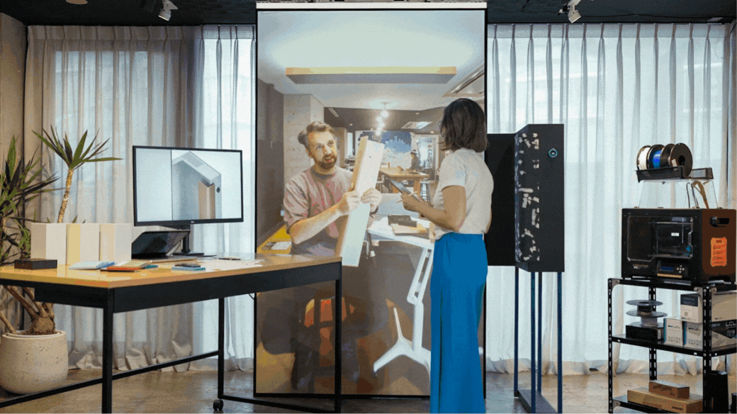 「tonari」は、等身大スクリーンと高速映像・音声処理によって遠隔拠点を超低遅延でつなぐ空間拡張テクノロジー。いつでも自然に声がかけられ、視線や振る舞いがそのまま伝わる、まるで同じ場所にいる一体感を生み出す。