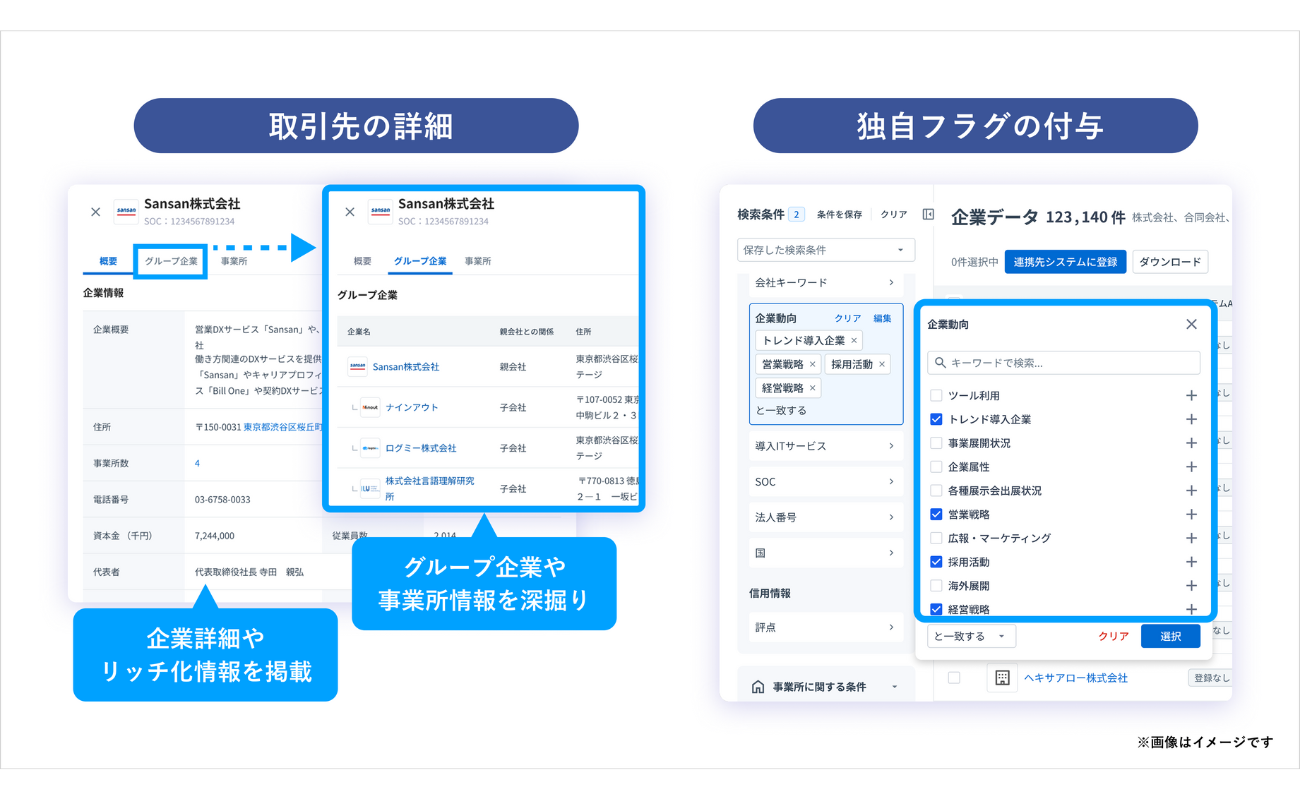 Sansan Data Intelligenceは、名刺・請求書データ等の処理実績と名寄せ技術を活用したデータクオリティマネジメントサービスである。800万件以上の独自企業・事業所データベースを基盤に、取引先情報の重複や更新漏れの補正を実現し、AI活用や戦略立案に必要な高品質なデータ基盤の構築を支援する。具体的には、基幹システムやCRM、SFA上の取引先データと連携し、自動的に企業・事業所を特定、独自識別コード「Sansan Organization Code」を付与する。これによりグループ系列やリッチな属性情報(従業員規模・業種等)を一元的に把握しつつ、人手に頼っていたデータメンテナンスの省力化と高品質なデータの維持が可能となる。また、登録時の正確なデータ提案やアップデート通知も備える。