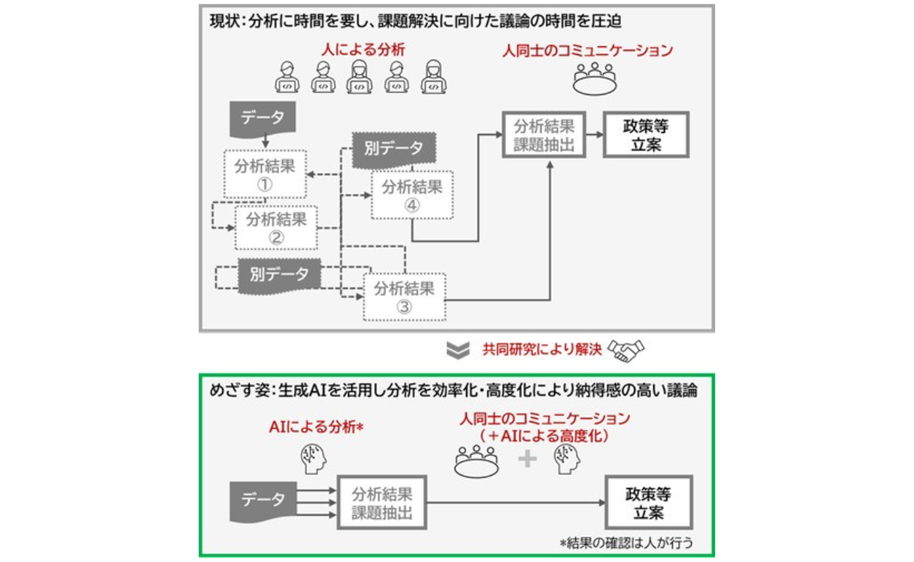 本共同研究は、自治体におけるデータ利活用の高度化ニーズの増加を受けて進められる。ビッグデータ社会の進展を背景に、自治体では定量的なデータ根拠に基づく政策立案(EBPM:根拠に基づく政策立案)の重要性が高まっているが、データ分析手法の複雑さや多様なデータを横断的に扱う難しさから、現場の負担増加や十分な戦略策定時間の確保が課題となっている。