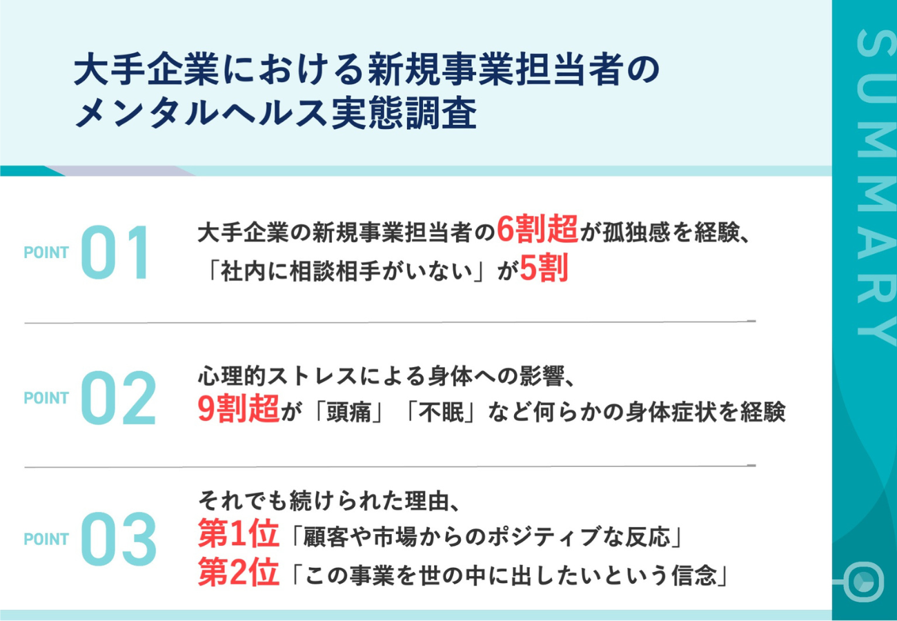 Engineerforceは、大手企業において、新規事業に2年以上従事した経験がある110名を対象にメンタルヘルス実態調査を実施した。