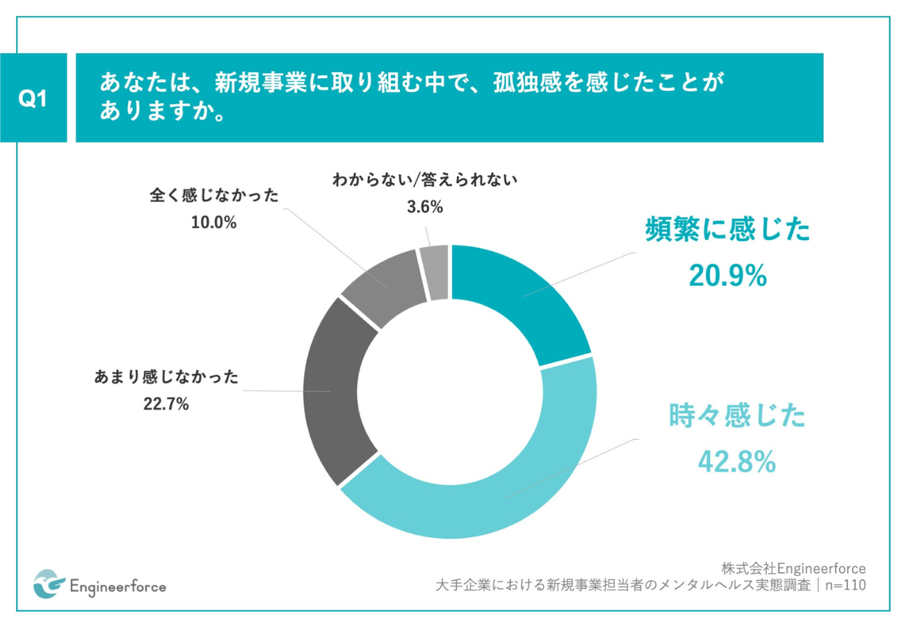 「Q1.あなたは、新規事業に取り組む中で、孤独感を感じたことがありますか。」(n=110)と質問したところ、「頻繁に感じた」が20.9%、「時々感じた」が42.8%という回答となった。