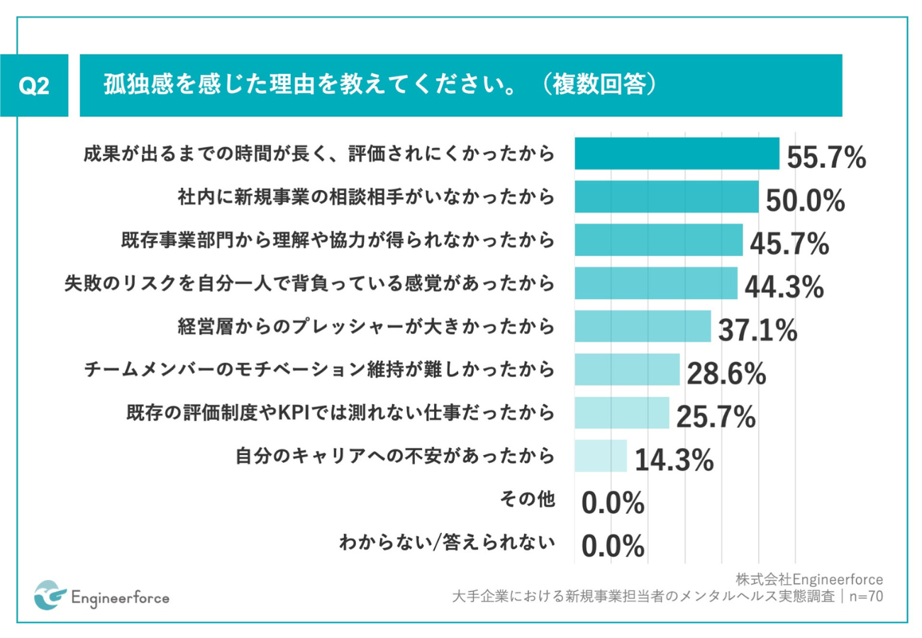 Q1で「頻繁に感じた」「時々感じた」と回答した人に、「Q2.孤独感を感じた理由を教えてください。(複数回答)」(n=70)と質問したところ、「成果が出るまでの時間が長く、評価されにくかったから」が55.7%、「社内に新規事業の相談相手がいなかったから」が50.0%、「既存事業部門から理解や協力が得られなかったから」が45.7%と回答した。