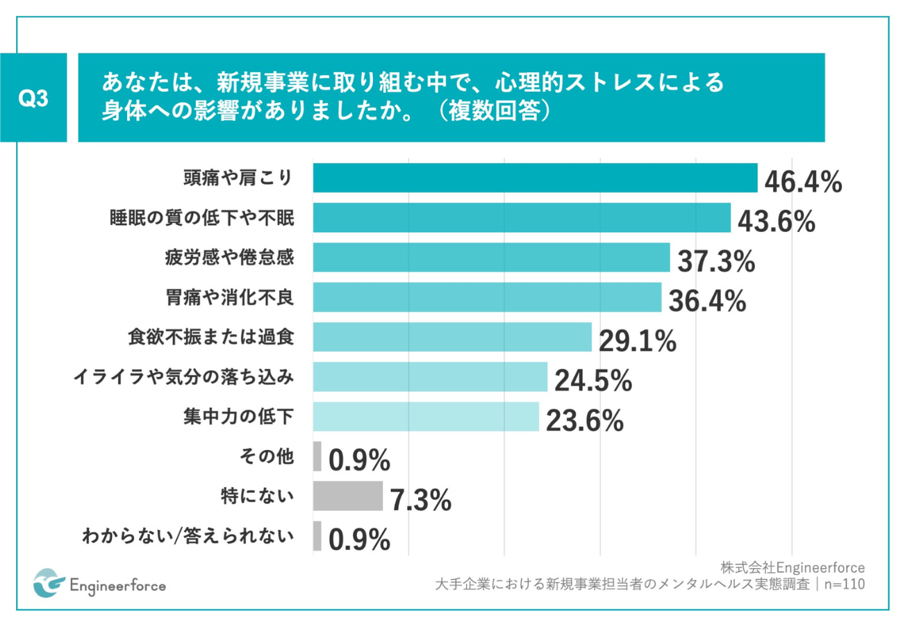 「Q3.あなたは、新規事業に取り組む中で、心理的ストレスによる身体への影響がありましたか。(複数回答)」(n=110)と質問したところ、「頭痛や肩こり」が46.4%、「睡眠の質の低下や不眠」が43.6%、「疲労感や倦怠感」が37.3%と回答した。