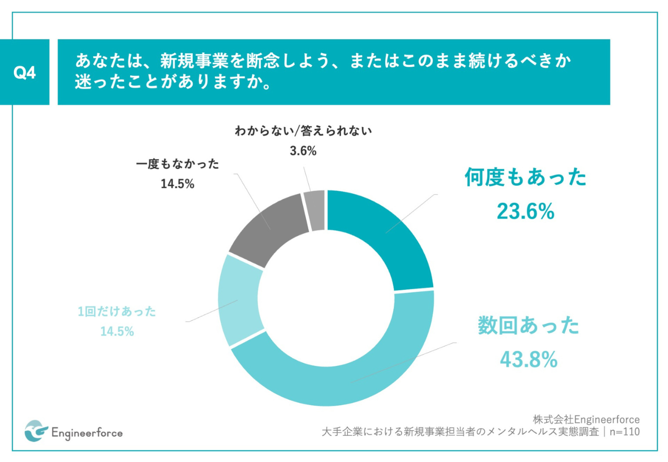 「Q4.あなたは、新規事業を断念しよう、またはこのまま続けるべきか迷ったことがありますか。」(n=110)と質問したところ、「何度もあった」が23.6%、「数回あった」が43.8%となった。