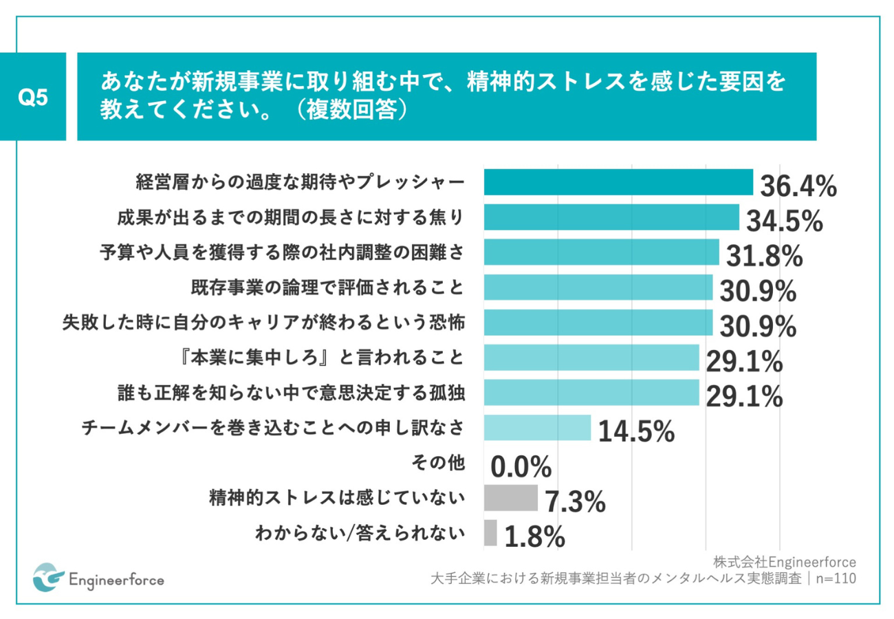 「Q5.あなたが新規事業に取り組む中で、精神的ストレスを感じた要因を教えてください。(複数回答)」(n=110)と質問したところ、「経営層からの過度な期待やプレッシャー」が36.4%、「成果が出るまでの期間の長さに対する焦り」が34.5%、「予算や人員を獲得する際の社内調整の困難さ」が31.8%となった。
